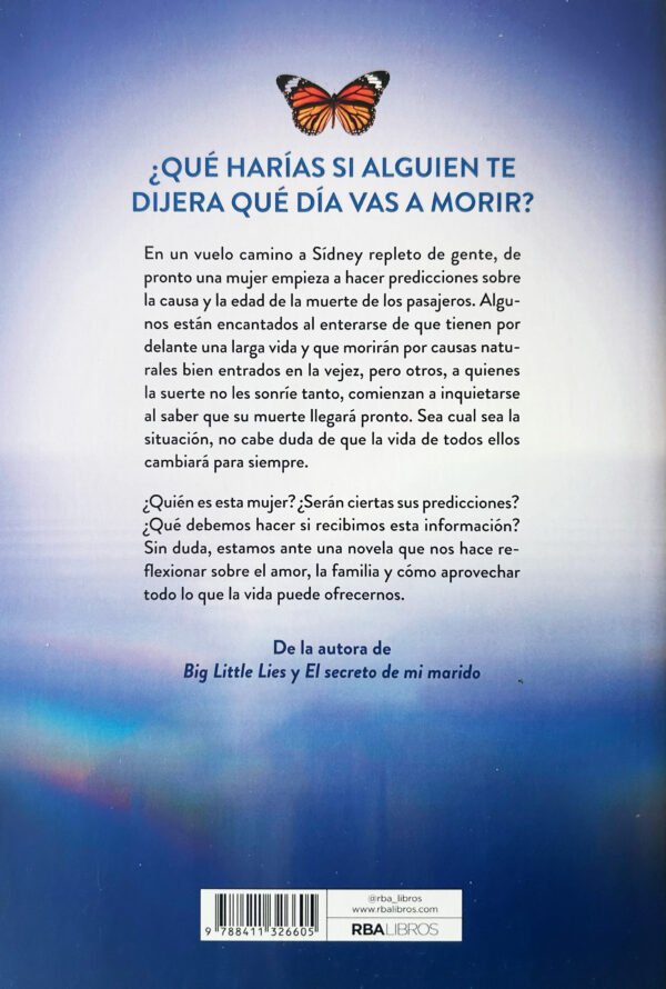 ¿QUÉ HARÍAS SI ALGUIA TE DIJERA QUÉ DÍA VAS A MORIR? En un vuelo camino a Sídney repleto de gente, de pronto una mujer empieza a hacer predicciones sobre la causa y la edad de la muerte de los pasajeros a bordo. Algunos son encantados al enterarse de que tienen por delante una larga vida y que morirán por causas naturales bien entrados en la vejez, pero otros, a quienes la suerte no les sonríe tanto, comienzan a inquietarse al recibir la información de que su muerte es pronto. Sea cual sea la situación, lo que no cabe duda es que la vida de todos ellos cambiará para siempre. ¿Quién es esta mujer? ¿Serán ciertas sus predicciones? ¿Qué hacer si recibimos esta información? Sin duda, estamos ante una novela que nos hace reflexionar sobre el amor, la familia y cómo aprovechar todo lo que la vida puede ofrecernos. De la autora de Big Little Lies y El secreto de mi marido