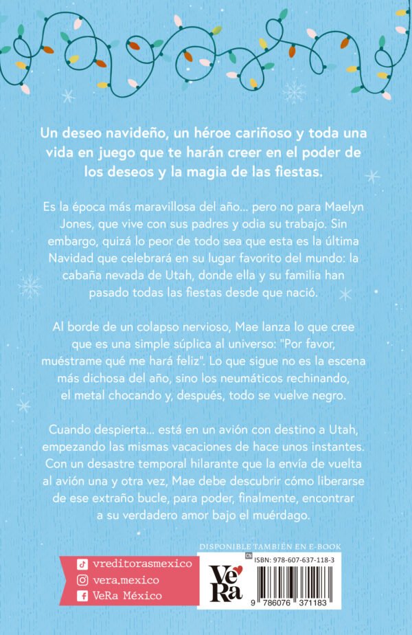 Un deseo navideño, un héroe cariñoso y toda una vida en juego que te harán creer en el poder de los deseos y la magia de las fiestas. Es la época más maravillosa del año… pero no para Maelyn Jones, que vive con sus padres y odia su trabajo. Sin embargo, quizá lo peor de todo sea que esta es la última Navidad que celebrará en su lugar favorito del mundo: la cabaña nevada de Utah, donde ella y su familia han pasado todas las fiestas desde que nació. Al borde de un colapso nervioso, Mae lanza lo que cree que es una simple súplica al universo: “Por favor, muéstrame qué me hará feliz”. Lo que sigue no es la escena más dichosa del año, sino los neumáticos rechinando, el metal chocando y, después, todo se vuelve negro. Cuando despierta… está en un avión con destino a Utah, empezando las mismas vacaciones de hace unos instantes. Con un desastre temporal hilarante que la envía de vuelta al avión una y otra vez, Mae debe descubrir cómo liberarse de ese extraño bucle, para poder, finalmente, encontrar a su verdadero amor bajo el muérdago.