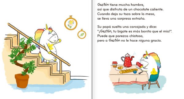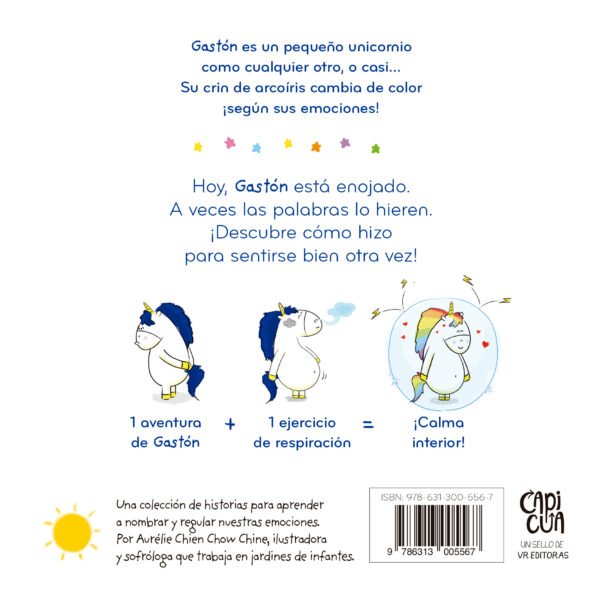 Gastón es un unicornio como cualquier otro, o casi… Su crin de arcoíris cambia de color ¡según sus emociones! Una colección de historias para aprender a nombrar y regular nuestras emociones. Por Aurélie Chien Chow Chine, ilustradora y sofróloga que trabaja en jardines de infantes. Los niños con los que trabaja inspiraron a la autora para crear el personaje del unicornio Gastón, el héroe de la serie “Las emociones de Gastón”, publicada originalmente en francés por Hachette Enfants. Gastón es un pequeño unicornio diferente a los demás. Tiene una particularidad: su melena luce los colores del arco iris cuando está bien, pero en cuanto una emoción fuerte lo embarga, su melena y su cola cambian de color según su estado de ánimo: tristeza o enojo, por ejemplo. A lo largo de la serie, cada libro trabaja una emoción diferente, se dan pequeñas lecciones sobre cómo reconocerla y, al final, la autora deja ejercicios muy fáciles para poder controlarla.
