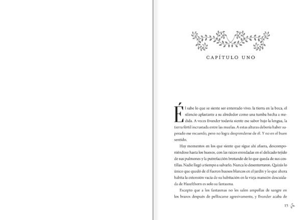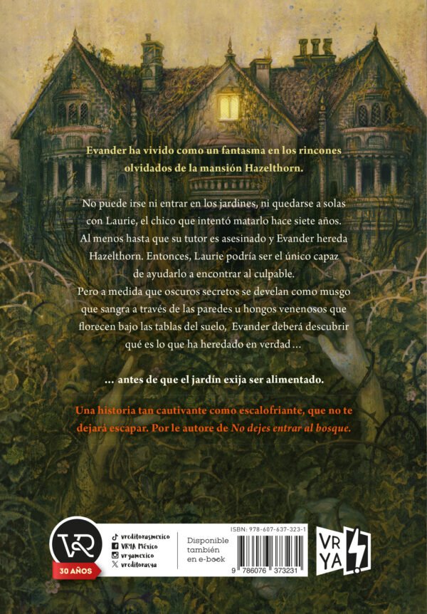 Evander ha vivido como un fantasma en los rincones olvidados de la mansión Hazelthorn. No puede irse ni entrar en los jardines, ni quedarse a solas con Laurie, el chico que intentó matarlo hace siete años. Al menos hasta que su tutor es asesinado y Evander hereda Hazelthorn. Entonces, Laurie podría ser el único capaz de ayudarlo a encontrar al culpable. Pero a medida que oscuros secretos se develan como musgo que sangra a través de las paredes u hongos venenosos que florecen bajo las tablas del suelo, Evander deberá descubrir qué es lo que ha heredado en verdad… antes de que el jardín exija ser alimentado. Una historia tan cautivante como escalofriante, que no te dejará escapar. Por le autore de «No dejes entrar al bosque».